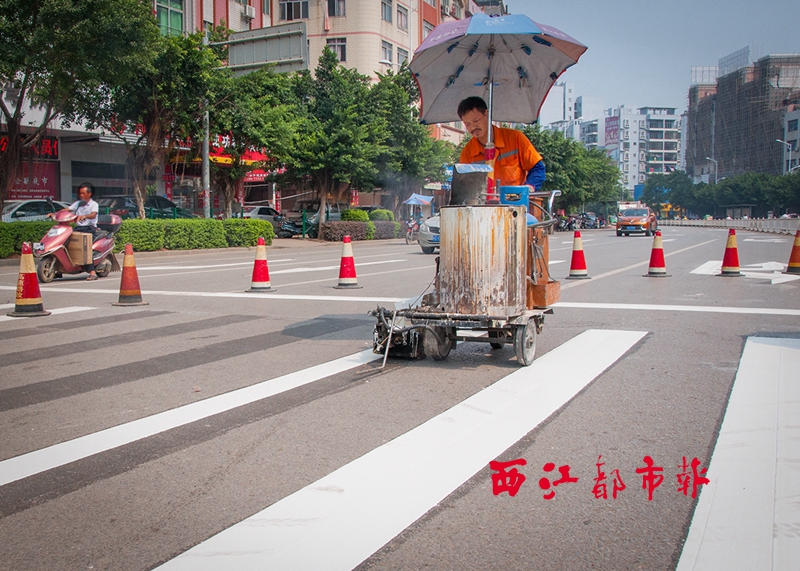 ??? 9月19日,工作人員正在給藤縣津南路一處斑馬線刷上醒目的白漆。