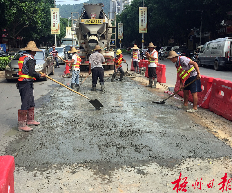 9月22日,在新興二路京梧市場對出道路,施工人員正在攤鋪混凝土修復路面。