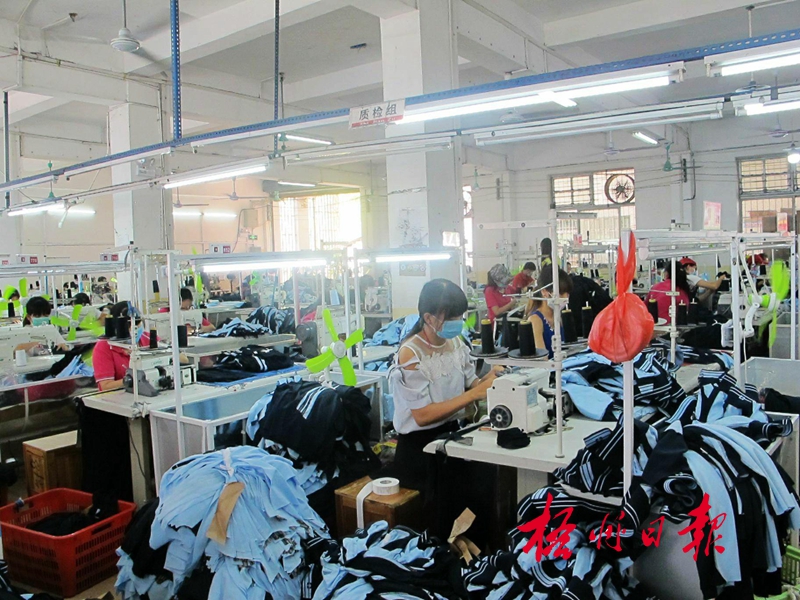 ??? 9月21日,岑溪市百裕實(shí)業(yè)有限公司制衣車間正在生產(chǎn)中。