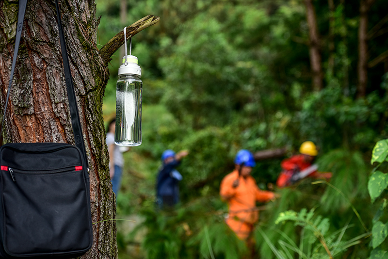 現(xiàn)場工作人員看到剛砍下的樹障,稍作休息片刻。
