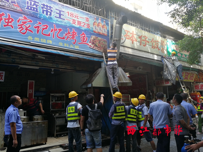 ?9月25日,在新湖一路一家飲食店,城管執(zhí)法人員依法拆除該店違規(guī)安裝的抽油煙機(jī)。西江都市報(bào)記者 吳艷虹 攝