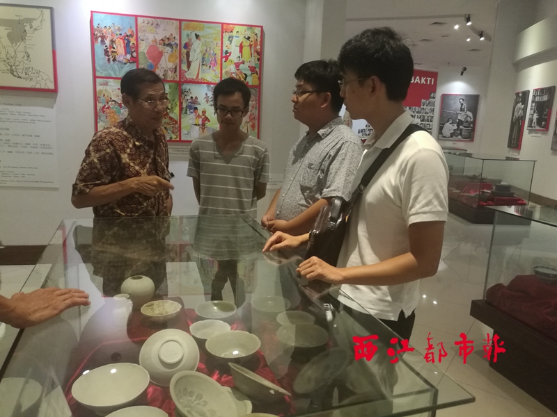 在印尼客家博物館里,博物館的執事經理周樹興(左一)向記者介紹當地華人的生活習俗。西江都市報記者 蘇愛清 攝