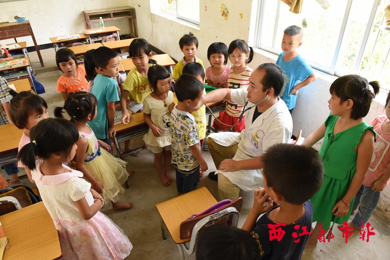 ?近日,梧州市紅十字會醫院黨委組織黨員醫務人員到蒼梧縣貧困村里深村對村民進行義診。圖為袁中良醫生為當地小學生進行健康體檢。 鄧淑冰 攝