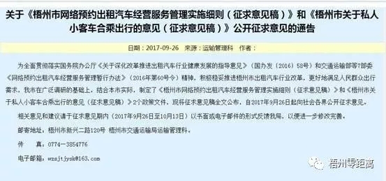 ??? 9月26日,市交通運輸局發布通告,就《梧州市網絡預約出租汽車經營服務管理實施細則(征求意見稿)》(下稱《網約車管理細則》(征求意見稿))和《梧州市關于私人小客車合乘出行的意見(征求意見稿)》(下稱《私人小客車合乘出行意見》(征求意見稿))公開征求意見。