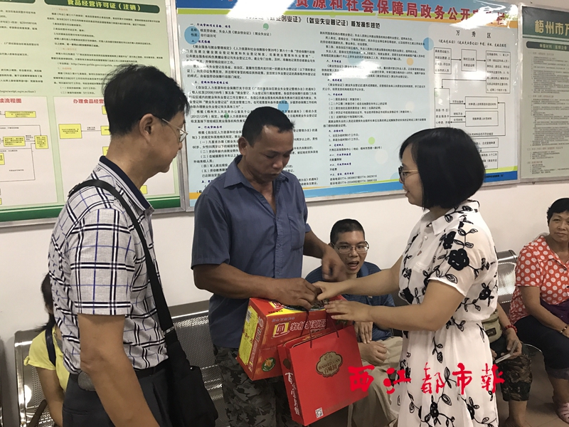 ????西江都市報訊(記者 李玉瑩)金秋送爽,佳節將至,9月28日上午,在梧州市萬秀區政務服務中心大廳,梧州日報社黨員、團員代表給萬秀區12位貧困殘疾人送上月餅、面餅等慰問品和節日的祝福。