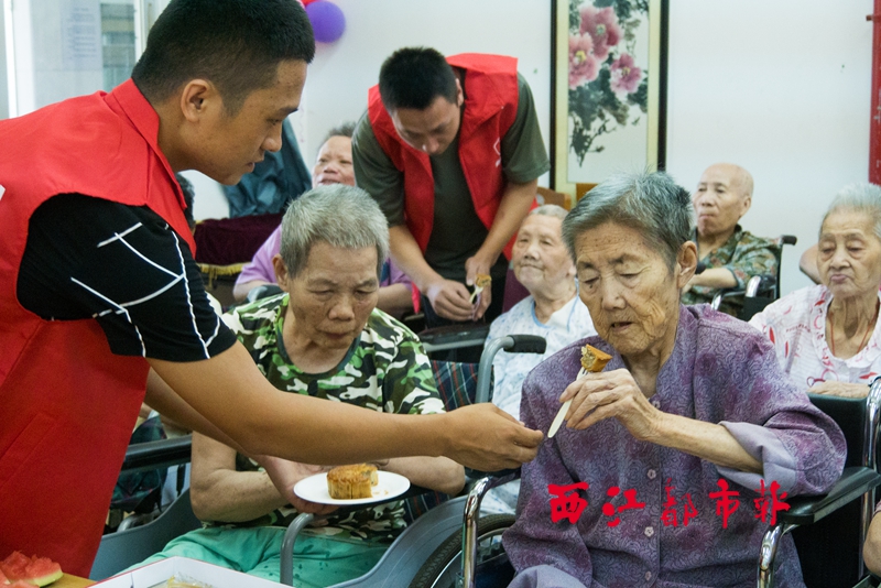 ??? 9月29日上午,強生醫院的志愿者走進華洋社區藍天幸福頤養院,向全院100多名老人送上月餅、牛奶等食物及節日的問候。 陳凡 攝