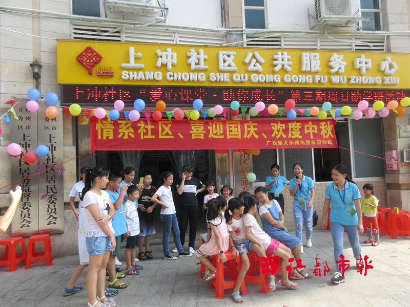 9月24日上午,上沖社區聯合“雙報到”單位及梧州學院國際交流學院青年志愿者,在星朗名都廣場舉辦“情系社區、喜迎國慶、歡度中秋”暨“愛心課堂·助你成長”第三期周日助學班活動。 紀榮蘭 攝