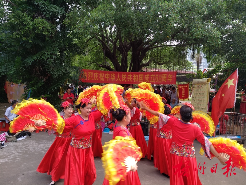 ??? 10月1日,在潘塘公園,社區(qū)文娛演員正表演歌舞節(jié)目。