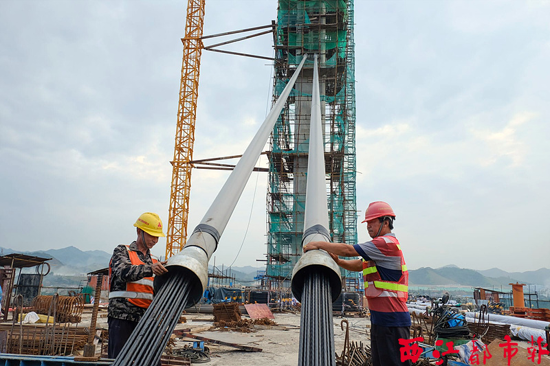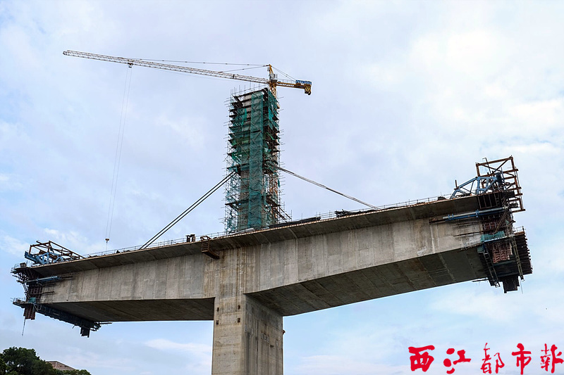 10月9日,扶典口西江特大橋1號主橋掛上了第一對斜拉索。