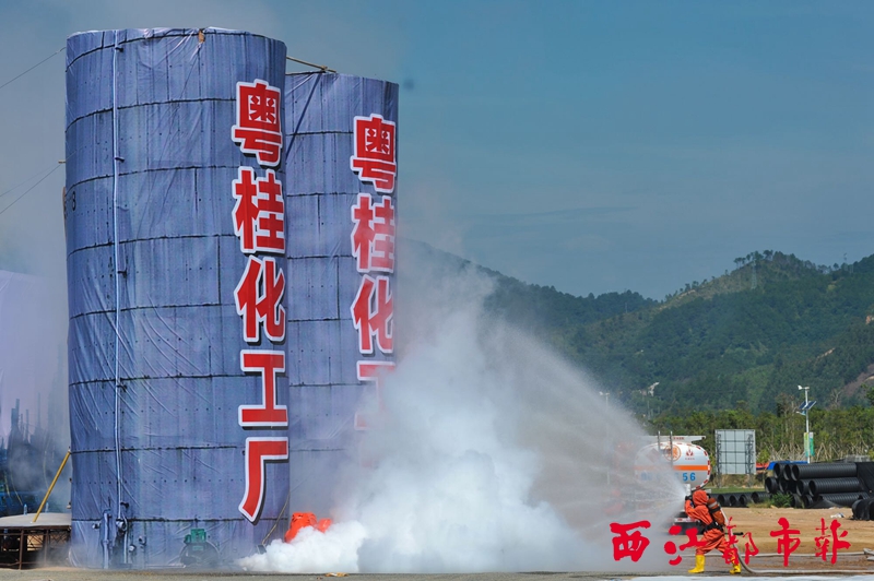 ????當天10時30分,演練正式開始。演練模擬在粵桂合作特別試驗區某化工企業內,兩名員工違規動火作業。電焊火花與柴油蒸汽接觸后,瞬時引爆了廠內的柴油儲罐,兩名作業人員被炸傷。因事發突然,在爆炸點不遠處的槽罐車進行液氨卸車的企業員工急忙將槽罐車駛離,但沒有及時將液氨儲罐的閥門關好,導致液氨泄漏后氣化并向四周彌漫,兩人因此中毒暈倒。