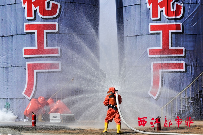 ??? 10月10日上午,2017年梧肇聯動安全生產應急救援演練在粵桂合作特別試驗區舉行。梧州與肇慶兩地的安監、公安、環保等多個部門組成應急救援工作小組參與了現場演練。消防官兵用開花水流噴淋泄漏罐體。