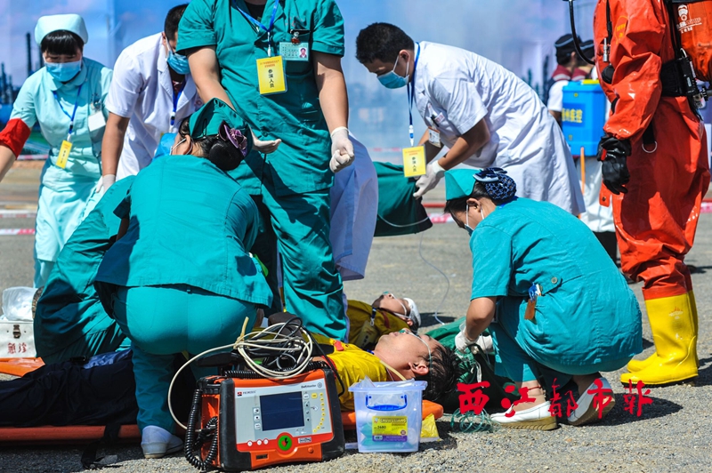 醫療救援組成員對受傷人員進行緊急治療。西江都市報記者 楊揚 攝