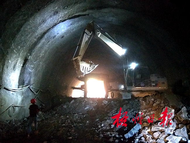 10月10日,在剛剛貫通的梧州環(huán)城公路熊沖隧道左洞,挖掘機(jī)在清理施工余泥。 黎海平 攝