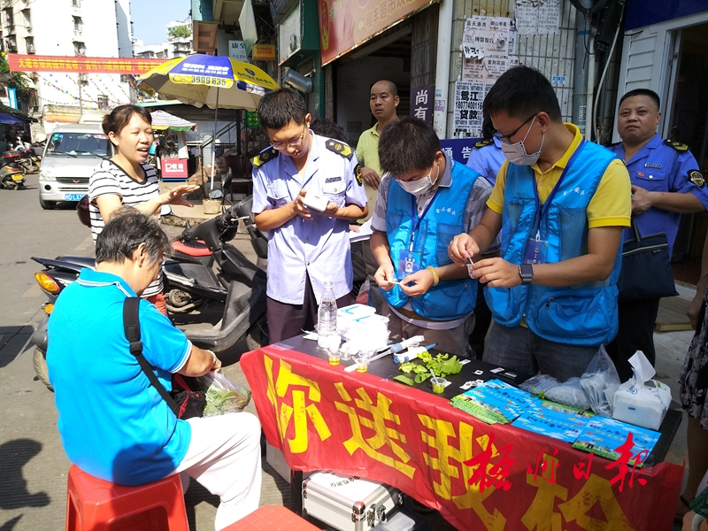 ??? 10月11日,在大塘市場旁,食品藥品檢驗人員為市民檢測蔬果質量安全。