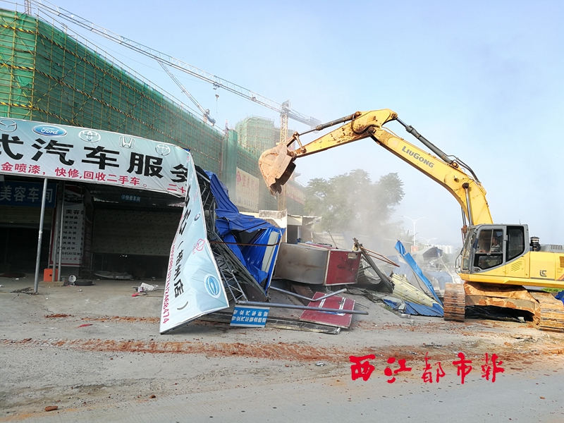 10月11日,在龍海三路,執法人員利用大型挖掘機拆除違章建筑。西江都市報記者 吳艷虹 攝