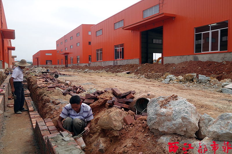 ????在項目現(xiàn)場,包括廠房、員工宿舍和倉庫在內的11幢橘紅色建筑特別醒目,40多名工人正在廠區(qū)內修建地下排水渠。廠房內,技術工人正在調試、安裝生產設備。