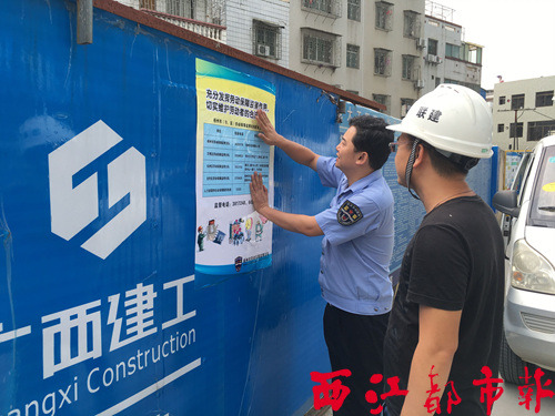 10月12日上午,勞動監察員在工地現場張貼勞動保障監察機構聯系方式等內容的宣傳單。記者 謝韻 攝
