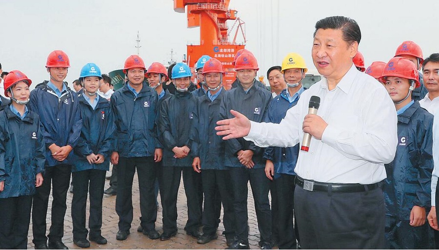 ????2017年4月19日至21日,中共中央總書記、國家主席、中央軍委主席習(xí)近平在廣西視察。這是4月19日下午,習(xí)近平在北海市鐵山港公用碼頭親切看望在現(xiàn)場作業(yè)的工人們。 新華社記者 鞠鵬 攝