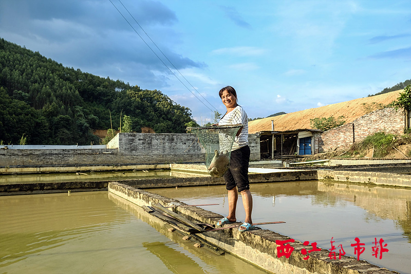????圖為10月10日,萬秀區(qū)龍湖鎮(zhèn)塘源村精準(zhǔn)幫扶龜鱉養(yǎng)殖基地內(nèi),養(yǎng)殖戶羅健新妻子展示黃沙鱉。