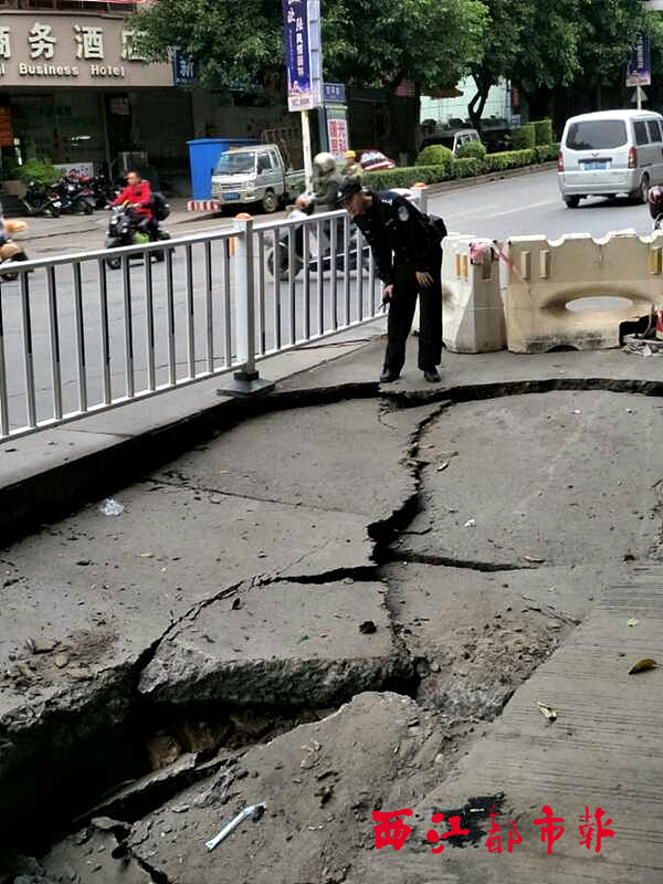 ????10月16日,在西環(huán)路新興二路路口、大塘小學(xué)對(duì)開路面的塌陷點(diǎn),塌陷面積突然增大。交警部門和市政部門研判后,決定對(duì)該路段實(shí)施臨時(shí)交通管制。