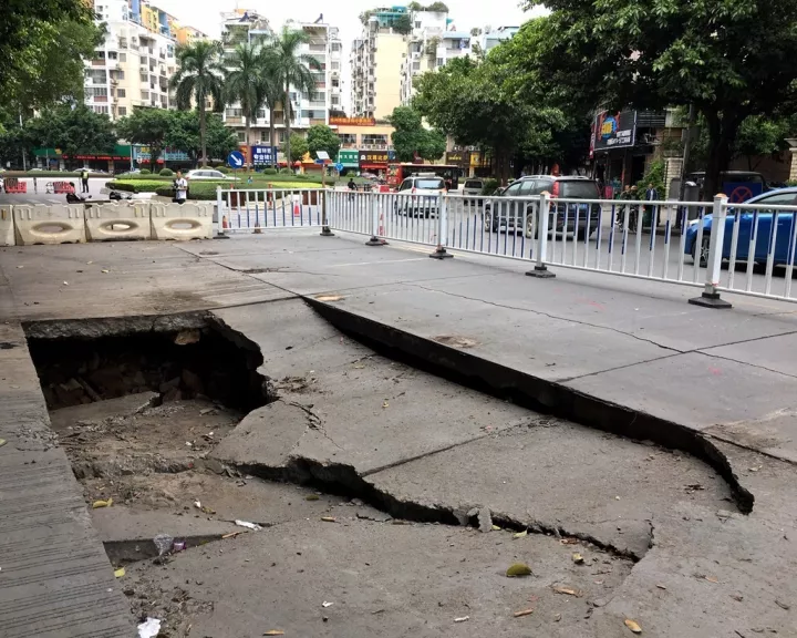 ????據負責該修復工程的市市政工程管理處三工區書記梁明光介紹,該處路面于8月30日出現塌陷,昨日下午塌陷面積突然擴大,目前塌陷區域長約20米,寬約12米,面積約240平方米,引發路面進一步塌陷的主要原因為塌陷區內的拱渠局部地方拱頂、側墻破損掏空,拱渠周邊泥土從破損處流出,從而導致路面在此出現掏空下陷現象。