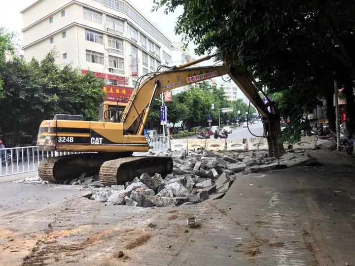 ??? 今天(10月17日)下午,市市政工程管理處采取應急搶險措施,對塌陷路面進行修復工程施工,記者在施工現場看到,一輛帶炮鉤機正在破挖路面,現場還有燃氣、供水、通信等部門的工作人員在配合施工。