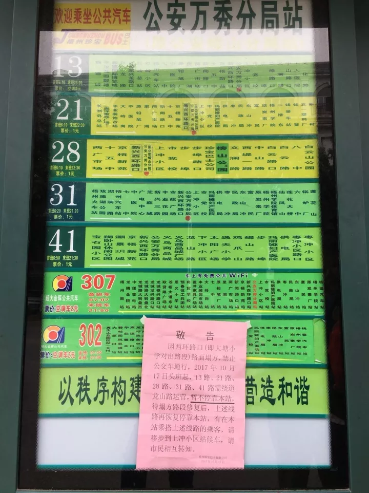 ????記者從梧州珍寶巴士有限公司及梧州超大金暉運輸集團有限公司兩處了解到,從今天起,原從新興二路行經西環路方向的13路、21路、28路、31路、41路、302路、307路公交車將繞道龍山路通行,繞道期間,上述線路車輛暫不停靠公安萬秀分局站,在原站點搭乘上述線路車輛的市民,需移步到上沖小區站候車搭乘。待塌陷路段修復后,上述線路公交車將恢復原線路運營。