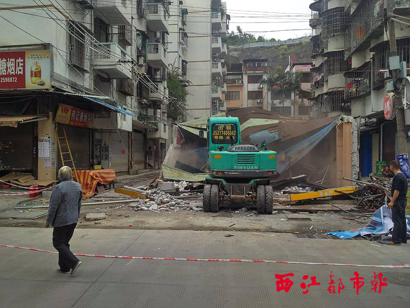 ????10月17日上午,在東山沖7—8棟居民樓附近,萬秀區城市管理局的執法人員拆除違章建筑。