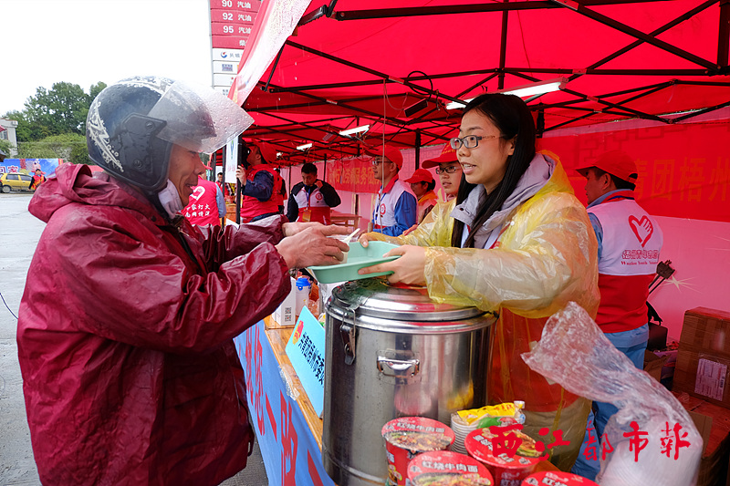????2017年春節,在廣西與廣東交界處的梧州市東出口服務站,大批身著紅衣的志愿者早早守候在此,為數萬返鄉過年的“摩托大軍”提供暖心服務。“開車幾個小時肯定手都凍僵了吧,來,喝杯姜茶、暖暖手。”“我們這里有熱騰騰的方便面,大家排好隊領取。”在寒冷的北風中,來自梧州市各行各業的志愿者們堅守東出口,為返鄉過年的農民工送上絲絲溫暖。
