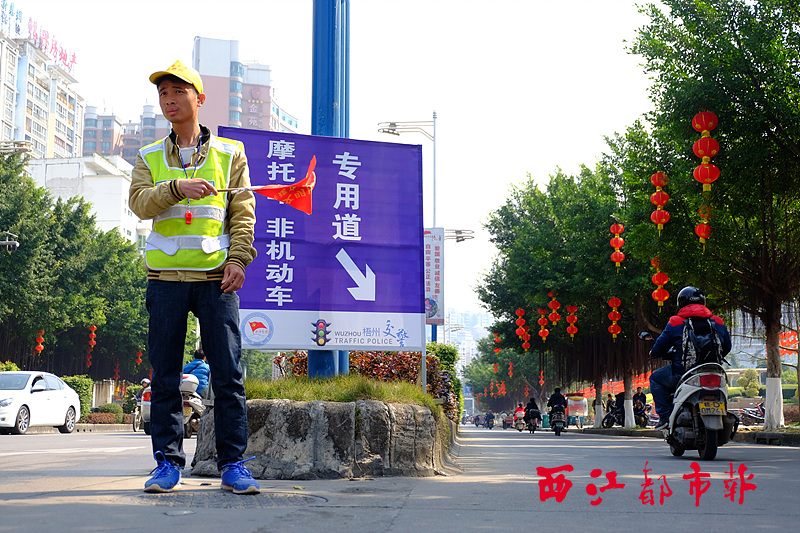2017年2月15日,志愿者在冬湖路與新興三路交匯處引導兩輪機動車進入專用道。 何鎏 攝