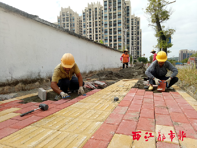 10月19日,市政部門的施工人員在紅嶺8號(hào)路人行道上鋪設(shè)透水磚。 西江都市報(bào)記者 吳艷虹 攝