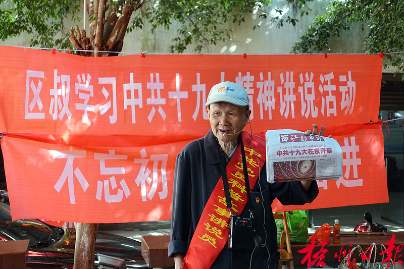 區(qū)朝坤今年已是86歲高齡,一直熱心于公益宣傳,他的“區(qū)叔故事會(huì)”深受當(dāng)?shù)厝罕娤矏?。黨的十九大開幕后,他認(rèn)真學(xué)習(xí)大會(huì)報(bào)告,把主要精神整理出來,結(jié)合自己的學(xué)習(xí)體會(huì)向公眾宣講。 霍金鈴 攝