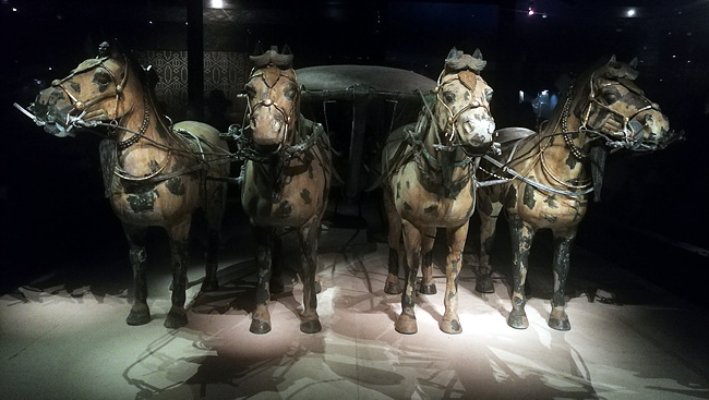 四個展館四種感受 秦始皇兵馬俑博物館對外開放一號、二號和三號三個墓坑以及展示館四個部分,四個部分給人不一樣的感受。 一號坑是三個墓坑中面積最大的,據說總面積達到1.6萬平方米。步入一號坑展廳大門,一個宏大的形如閱兵矩陣的場面猛然沖入你的視野,一列一列長坑里,整齊立著的士兵與馬匹在燈下發出一層幽光,仿佛在無言地訴說他們歷經千年尚未能忘懷的往事,那些往事里,是殺聲四起的沙場慘烈,是沖鋒陷陣的男兒豪情,抑或只是千百年來深埋地層的黯淡? 圍繞墓坑周邊欄桿,可從四個方向仔細觀看坑道內的兵馬俑,據說實際有超過6000件、已挖掘出來的有1000多件,他們分東、南、西、北四個朝向,分明是前鋒、翼衛和后衛的布置,而中間38路縱隊則形成主力軍團,觀者可充分感受一個行軍布陣的格局。俑像大都呈直立姿勢,兩腳堅定踩踏大地,雙目直視前方,甲胄整肅,神情凝重,須發與眉宇傳遞著一份身經百戰的英氣與從容,形如一堵無法撼動的銅墻鐵壁。而一同展示的戰馬,安靜肅立間,亦能從品出一種蓄勢待發的意味。 二號坑是兵馬俑精華部分的展示。從陶俑站立或蹲跪的姿勢來看,原來應是持有長矛與弓弩等兵械的,不知為何,兵械已然不見,但那生動傳神的姿態,仍然成為兵馬俑中最具生命意味的體現。這些不同姿勢、不同兵種的陶俑,有與駟馬戰車聯合而成車兵方陣,也有車、步、騎兵混合成長方陣,與一號坑的千軍萬馬相比,這里像是一支精銳部隊,或是我們今天所說的特種部隊,給游客另是一番觀感。三號坑較小,形狀像一個“凹”字,據說是作為作戰指揮部來布置的,從坑道內兩旁侍立的兵士俑像來看,也確實如此。 能夠更仔細參觀的,應屬展示館。展示館內以玻璃展示柜的模式,向觀者單個展出兵馬俑像,可近距離欣賞。讓我最為印象深刻的,是那輛四馬單轅的彩繪銅車,雖然展出品經過修復,但結合文字介紹中“3400個零部件、車馬金銀飾品1720件、金銀器總重7公斤”等資料,以及現場看到的精致造型和巧妙設計,還是讓我們嘆服于兩千多年前的造車工藝。 穿越時空修復還原 隔著悠長的歲月,帶著長久的地層氣息,這些肅穆的陶俑尚能清晰地讓人觸碰出它們的精、氣、神,那么制作俑像、并且是數量如此之多俑像的人,心思是何等的細膩,技藝是何等的精湛,也就可想而知了。所以秦始皇兵馬俑從1974年被發現、1979年對外開放參觀以來,獲得“世界第八奇跡”、“二十世紀考古史上的偉大發現之一”等美譽,實屬意料之中。 與俑像的數量以及精細所引發的驚嘆相比,在參觀過程中,另一個視角也在我們眼前緩緩展開。二號坑內保留有挖掘時發現的坑內狀況:兵馬俑橫七豎八躺倒在坑道內,殘肢斷臂、支離破碎;展示館內展覽有彩繪銅馬車出土時的照片:除四匹銅馬相對完整外,整個車體被壓塌,幾乎分辨不出原來的模樣。一號坑展示坑道的后半部分,有一個寬闊的場地,放置了現代化的機器,有工作人員在忙碌,有缺頭少臂或渾身包裹塑料紙的俑像排練周邊……精美完整的兵馬俑,歷經塵與土的包圍之后,借由考古工作者的心血與技藝,方得重生。兩千多年的地層深埋,龐大的兵馬俑隊伍已與身旁泥土呈同樣色澤,置他們于深埋命運的始作俑者,也帶著永生以及永遠操控強權的野心埋于此地,卻敵不過萬物一理,只能與泥土混為一體了。即使千年以后,因一個農民挖井的鐵楸、由一群不畏艱辛的考古工作者精心挖掘得以重見天日,經過深埋而失卻的色澤與光彩,沉淪于殉葬所帶來的黑暗與沉寂,成為它們永難磨滅的印記。這樣的視覺,帶來一份屬于時空的荒涼,也是參觀兵馬俑博物館的另一種感受了。 麥坤文/攝 |