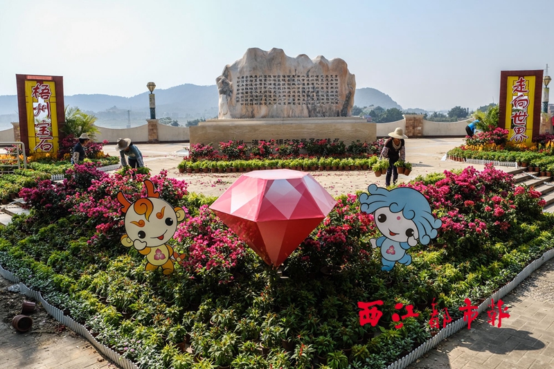??? 10月23日,在西堤公園音樂小廣場,園林綠化工人正在擺設花卉造型。隨著梧州寶石節臨近,日前,市政部門在市區多個景點和主要路段布置花卉造型,營造節慶氛圍。西江都市報記者 楊揚 攝