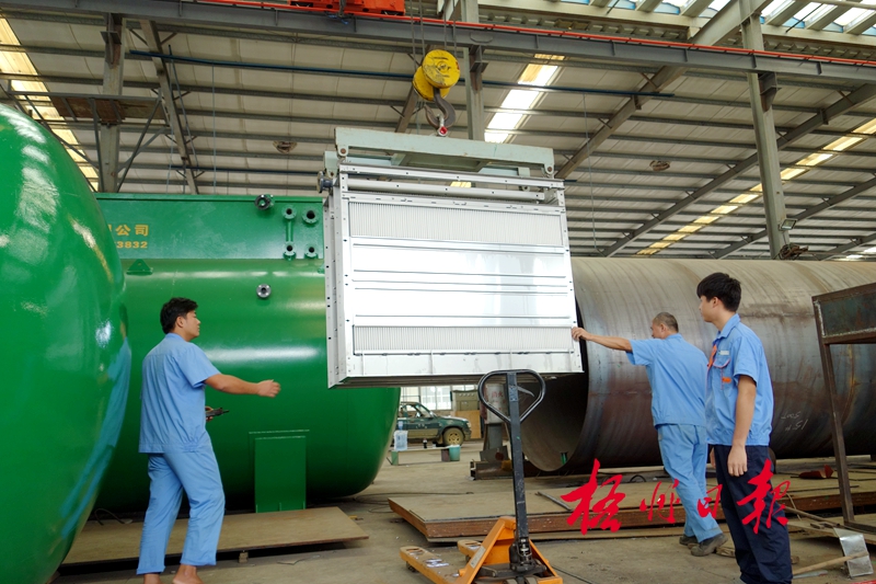 ??? 10月19日,在廣西梧州碧清源納米膜技術(shù)有限公司車間,工人正吊裝放置于污水處理設(shè)備內(nèi)的一體化納米陶瓷膜。