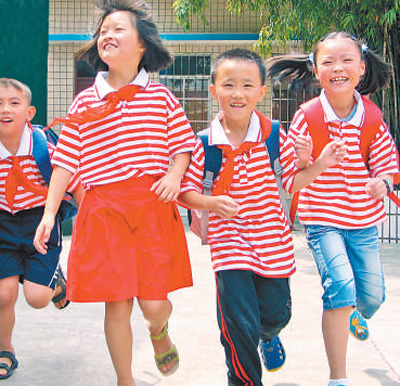 貴州貴陽達(dá)德小學(xué)學(xué)生興高采烈去上學(xué)。