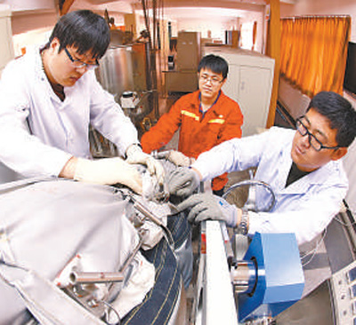 ?中國石油遼河油田公司勘探開發(fā)研究院的技術(shù)人員正開展實(shí)驗(yàn)。