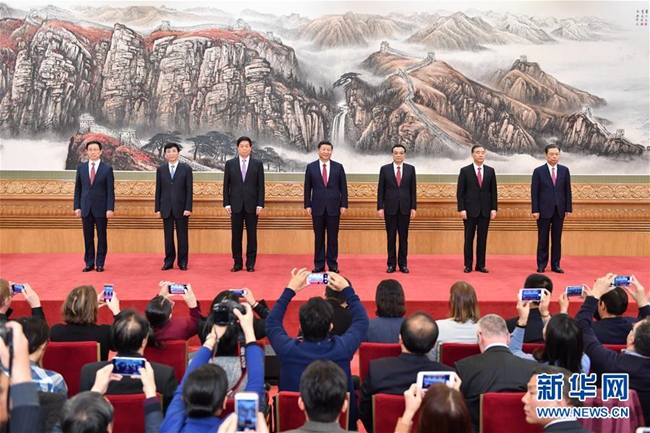 ??? 新華社北京10月25日電 世界的目光再次聚焦中國,剛剛在中國共產(chǎn)黨第十九屆中央委員會第一次全體會議上當選的中共中央總書記習近平和中共中央政治局常委李克強、栗戰(zhàn)書、汪洋、王滬寧、趙樂際、韓正,25日中午在人民大會堂同采訪中共十九大的中外記者親切見面。