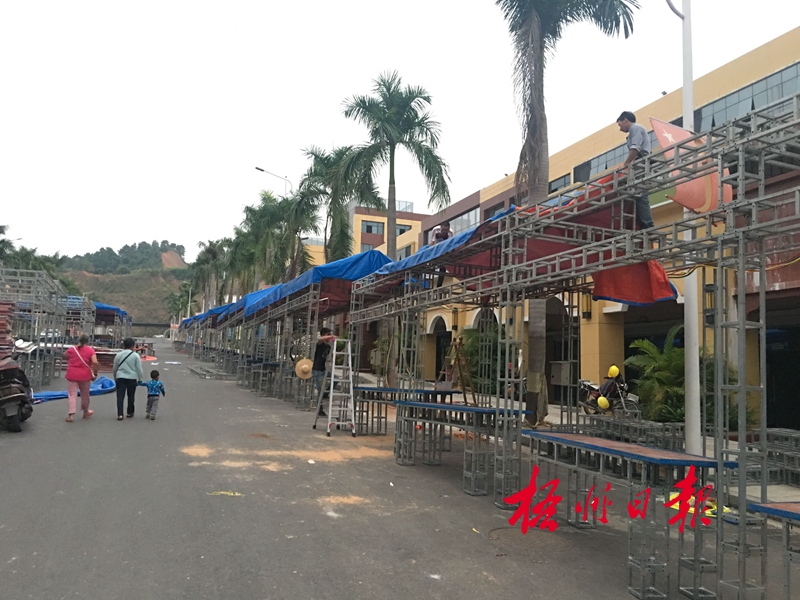 ??? 10月24日,在毅德國際博覽城西側大街,施工人員正搭建棚架、裝飾展位。第十四屆梧州寶石節美食嘉年華將在這里,目前,商家進場前各項準備工作同步推進。 梁燕如 攝