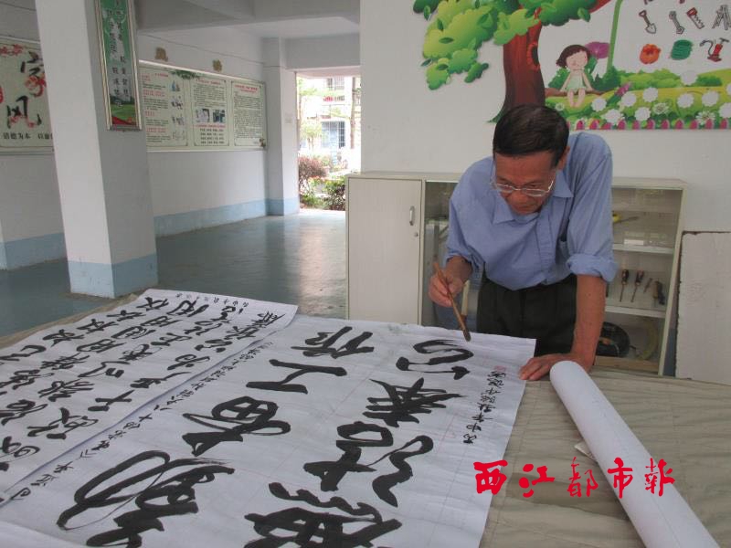 ????從那時(shí)開(kāi)始,陸中識(shí)“承包”了藍(lán)天社區(qū)會(huì)議條幅、節(jié)日宣傳標(biāo)語(yǔ)、社區(qū)居民文化室展覽的制作。最近,藍(lán)天社區(qū)舉辦“兩學(xué)一做”學(xué)習(xí)教育、“黨風(fēng)家風(fēng)”活動(dòng),陸中識(shí)根據(jù)社區(qū)工作人員提供的材料,很快制作了一個(gè)生動(dòng)、活潑的“廉政宣傳欄”手抄板報(bào)。除了幫助社區(qū),陸中識(shí)還經(jīng)常給社區(qū)居民義務(wù)寫(xiě)對(duì)聯(lián)和感謝信。