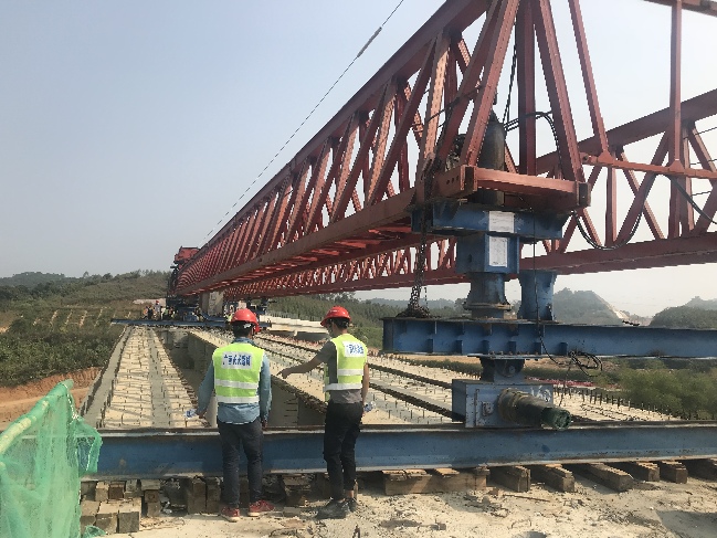 ???? 10月26日,梧柳高速公路項目施工現場,施工人員調試架梁機準備架設預制T梁。?本報記者?鄧發浩?攝