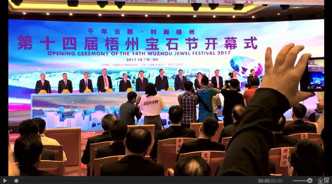 ?? “我宣布,第十四屆梧州寶石節開幕!”隨著劉君一聲宣布,13位領導、嘉賓共同推起寶石,此刻,LED大屏幕出現了象征寶石事業的巨輪乘風破浪向前航行,兩邊浪花朵朵。儀式臺前的屏幕呈現梧州城市的剪影,城市上空禮花絢麗綻放,音樂響起。現場響起熱烈的掌聲。