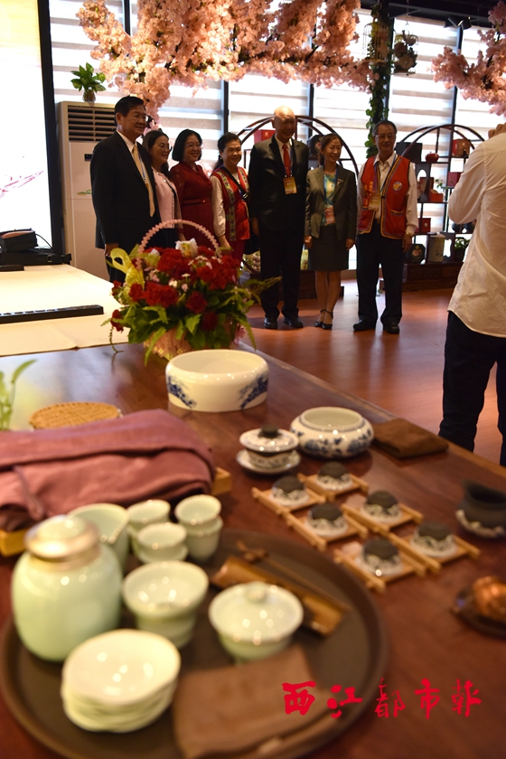 前來參觀的嘉賓和游客在拍攝采茶制茶工藝雕塑。西江都市報記者 何鎏 攝
