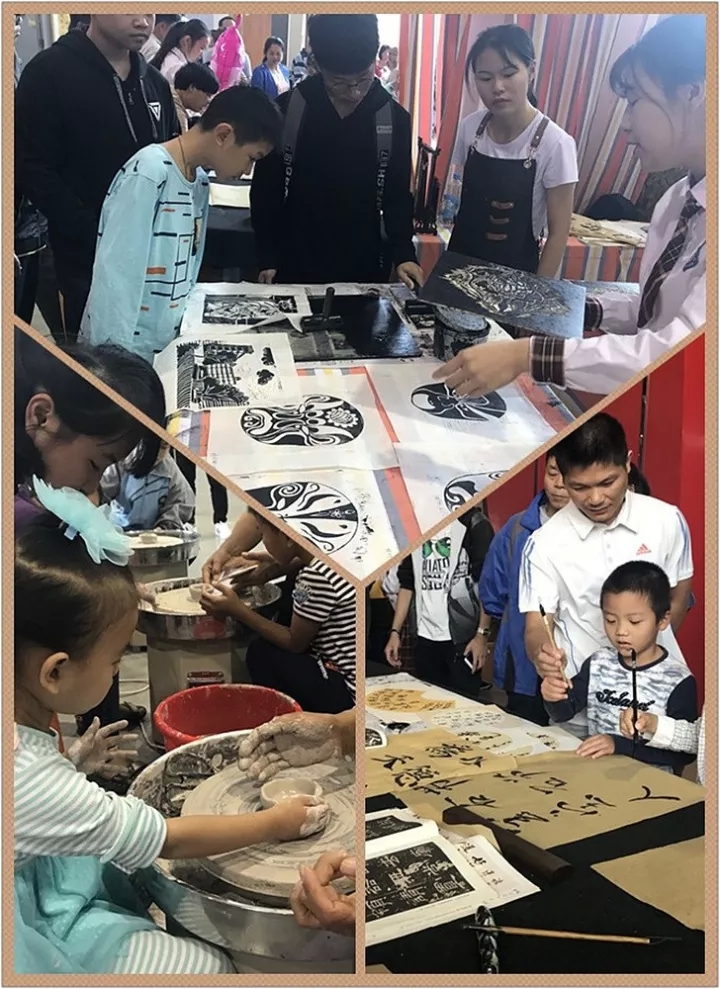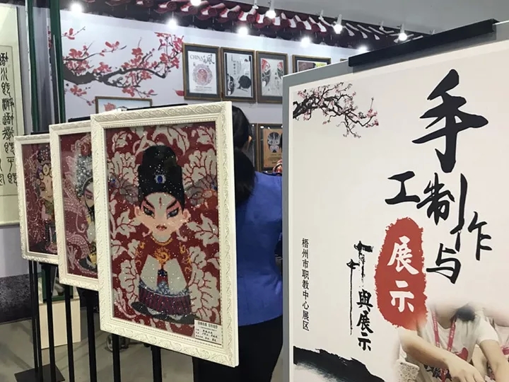 ?? “中小學(xué)生寶石手工平面粘貼畫作品和中學(xué)生書畫作品展示區(qū)”的梧州市第八中學(xué)藝術(shù)展示區(qū)內(nèi),市民群眾除了可欣賞到八中學(xué)生的藝術(shù)作品外,還可以現(xiàn)場體驗書法、板畫、陶土等制作。