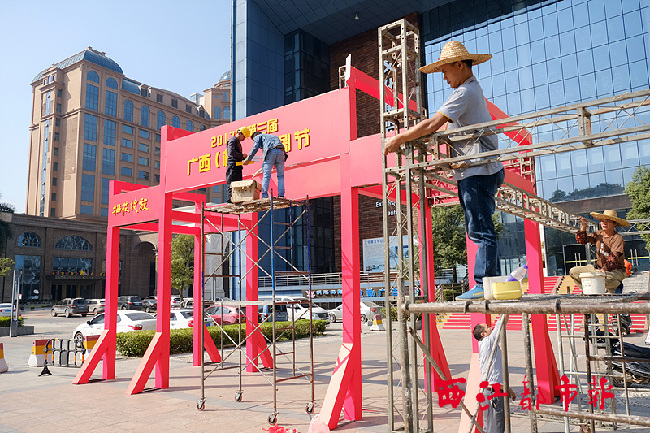 ????10月31日,施工人員在梧州市文化展覽中心門前廣場(chǎng)搭設(shè)裝飾棚架。