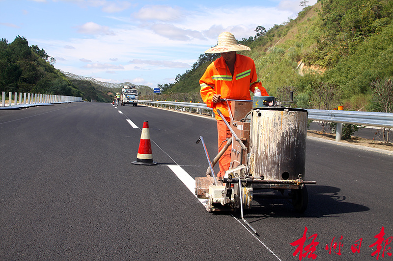 ????10月31日,在梧州至柳州高速公路藤縣段,施工人員在進行路面劃線作業(yè)。