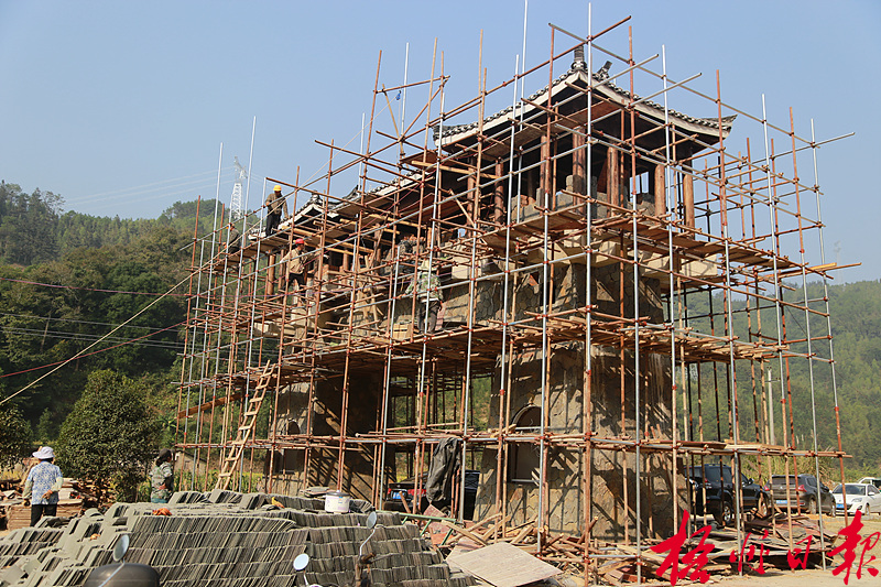 ????10月30日,在蒙山縣長坪瑤族鄉“水韻瑤寨”,工人正在加緊建設景區大門。