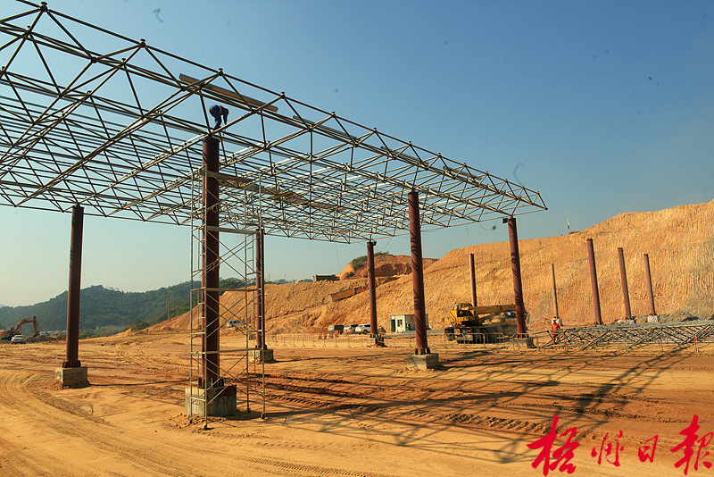 ????11月2日,在梧州環城高速省際二號互通,施工人員正在安裝收費站的頂棚。