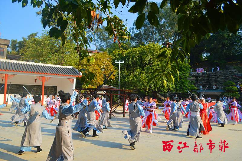 ????11月2日,100多位群眾演員在蒙山縣梁羽生公園認真排練以武俠小說《白發魔女傳》為藍本創作的舞臺劇。