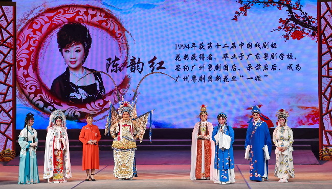 ? ? ?? ?開幕式后,“梅花綻放 薪火相傳”梅花獎得主盛演晚會開演,分為梨園粵韻、姹紫嫣紅、蓓蕾芬芳、萬紫千紅等四大篇章演出。馮剛毅、歐凱明、陳韻紅、梁素梅、黎駿聲、崔玉梅、吳非凡、蘇春梅等八名獲得梅花獎的廣東、廣西粵劇界演員,演出了平喉獨唱《寶玉詠芙蓉》選段、折子戲《三氣周瑜》選段、子喉獨唱《昭君出塞》、折子戲《白蛇傳》選段、折子戲《江姐》選段、子喉獨唱《搜書院》選段、折子戲《一把存忠劍》選段等精彩節目,為現場觀眾帶來一臺高水平的粵曲演唱會,博得陣陣熱烈的掌聲和喝彩。